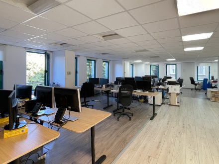 Офисът е с високи тавани, отваряеми прозорци и двоен под с окабеляване в подови кутии. Отоплението и охлаждането е с централна климатична инсталация.