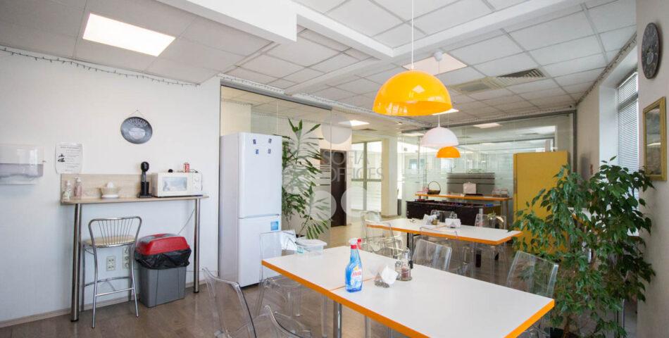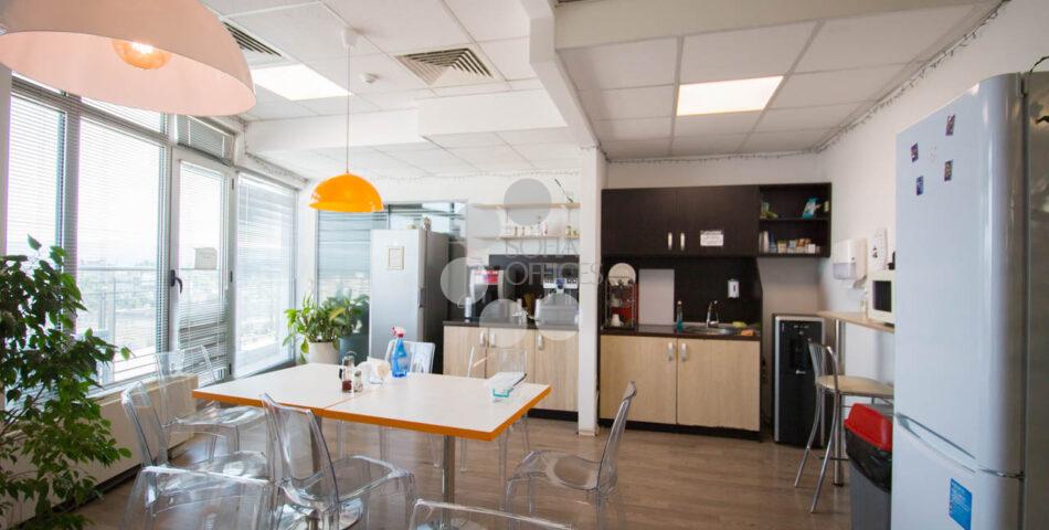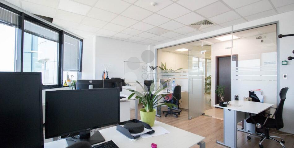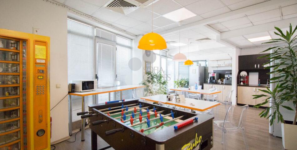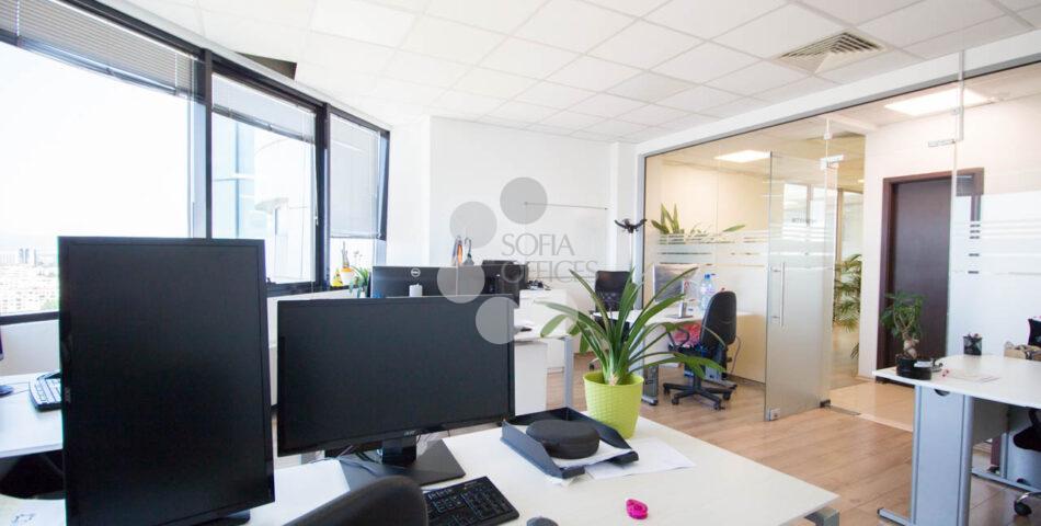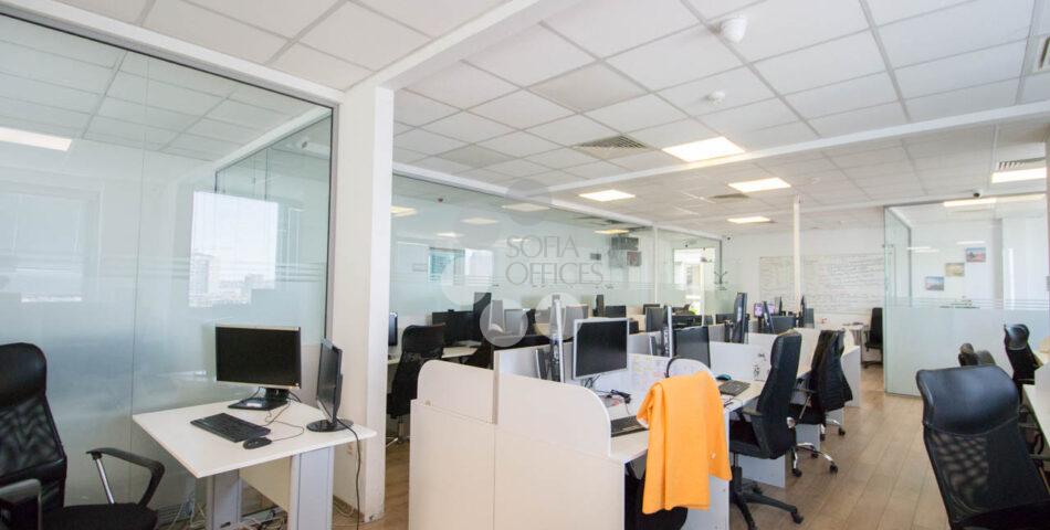 Офисът заема цял етаж от бизнес сградата, може да бъде с изцяло open space разпределение или различно преграждане съгласно нуждите ви. В момента се състои от няколко различни по големина работни помещения, преградени с гипсокартон и стъкло, сървърно, голяма кухня с място за хранене и релакс зона, 12 кв.м тераса и 6 санитарни възела.