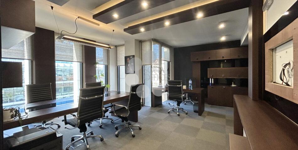 It has an open space with 6 separate desks, a meeting room/workroom, a kitchenette and a bathroom. The office is furnished with high-end custom furniture, has a double floor, central air-conditioning/heating system and openable windows.
