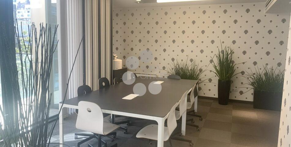 The office consists of an open-space workroom, a conference room separated from the main room by glass partitions, a furnished kitchen area, a terrace and a bathroom. The office is rented unfurnished.