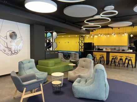 The office is furnished with 47 workstations, each with a desk measuring 140×70 sm.