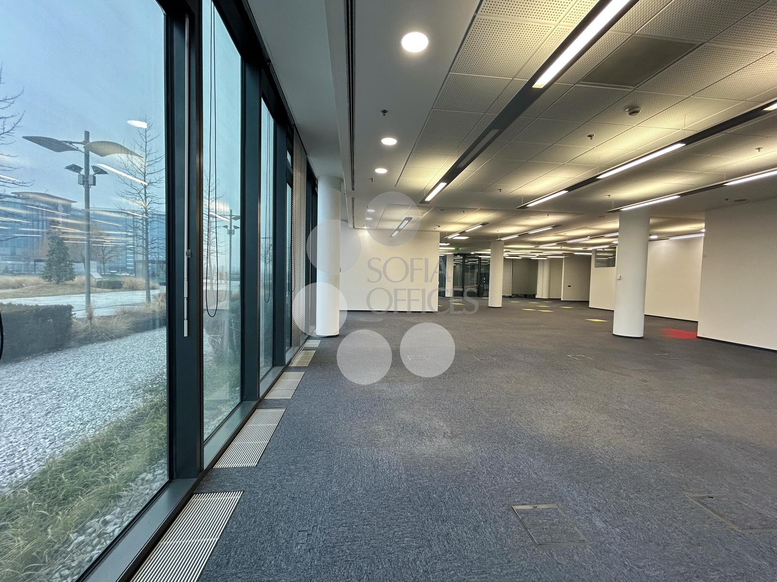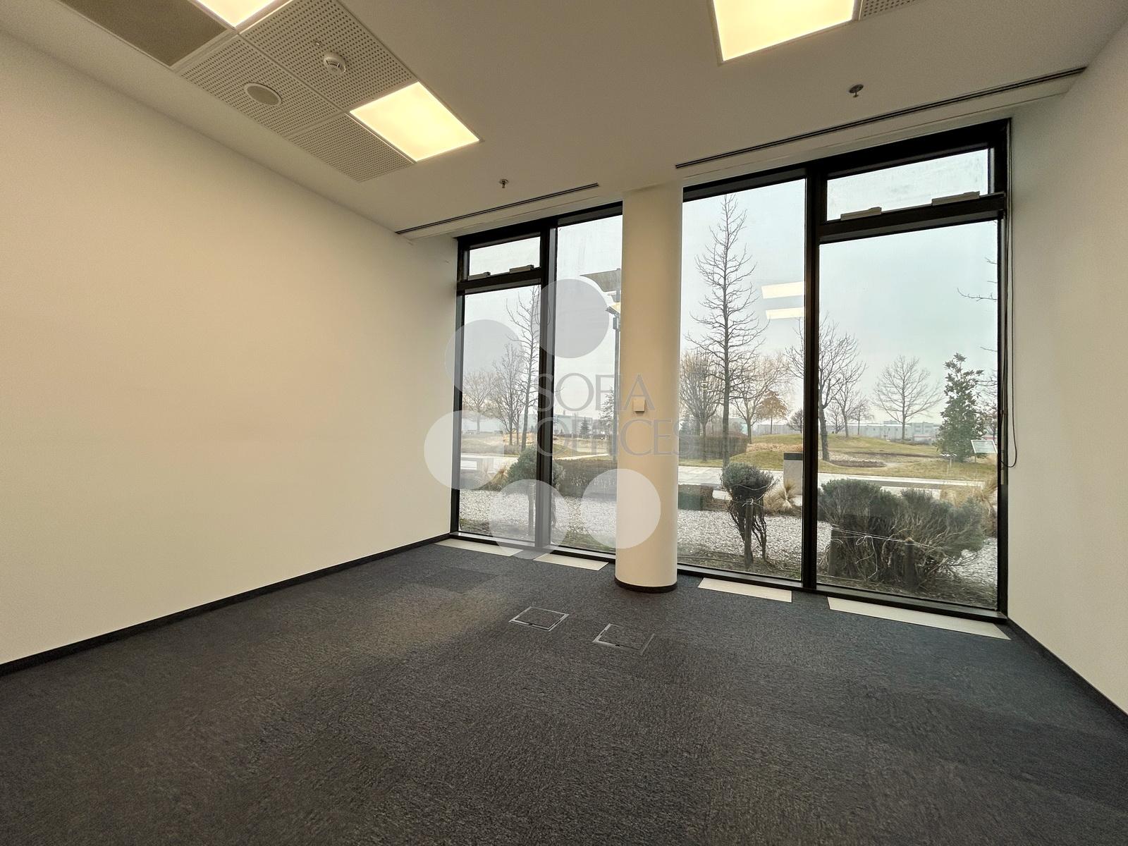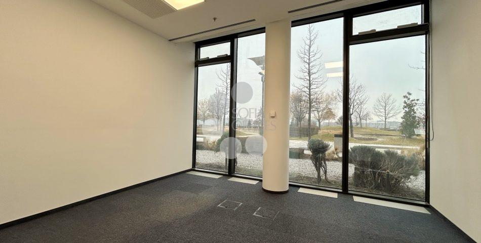 Sofia Offices presents this open space office for rent near Sofia Airport, located in a representative Class A office building within a modern business park. The office features southern exposure, is situated on the ground floor, and is surrounded by lush landscaping. The green environment, combined with high French windows and abundant natural light, creates a sense of openness and a direct connection to nature – a rare advantage for office space for rent in Sofia.