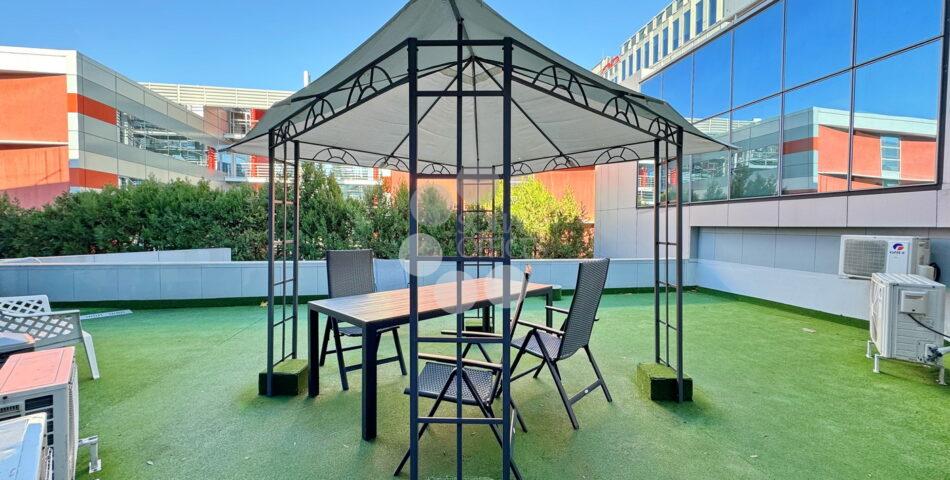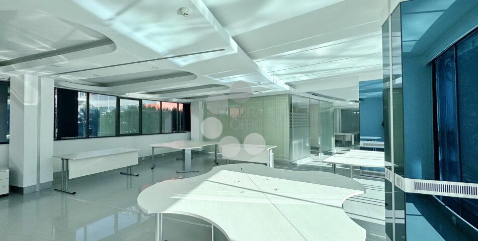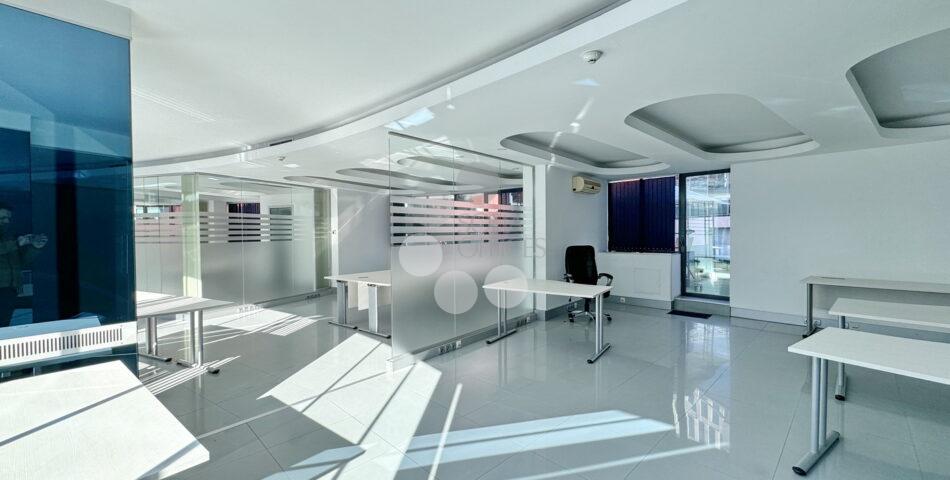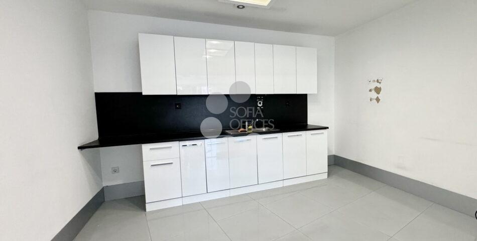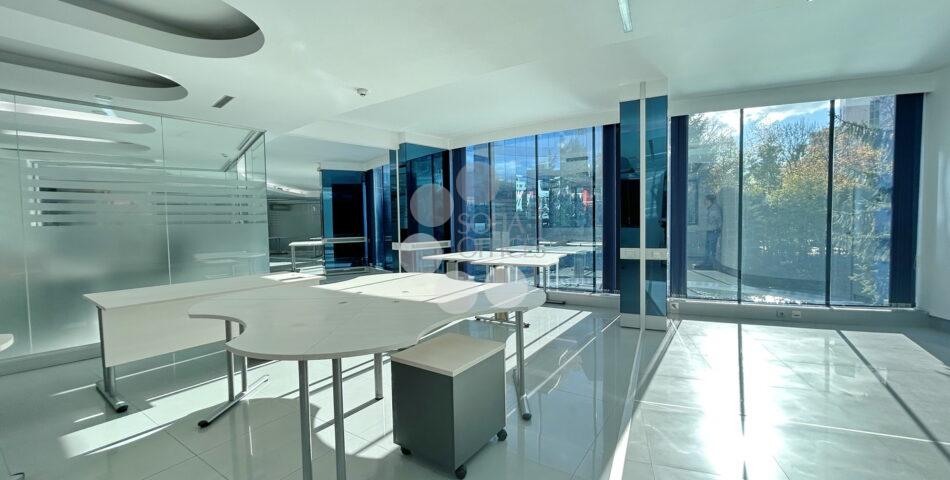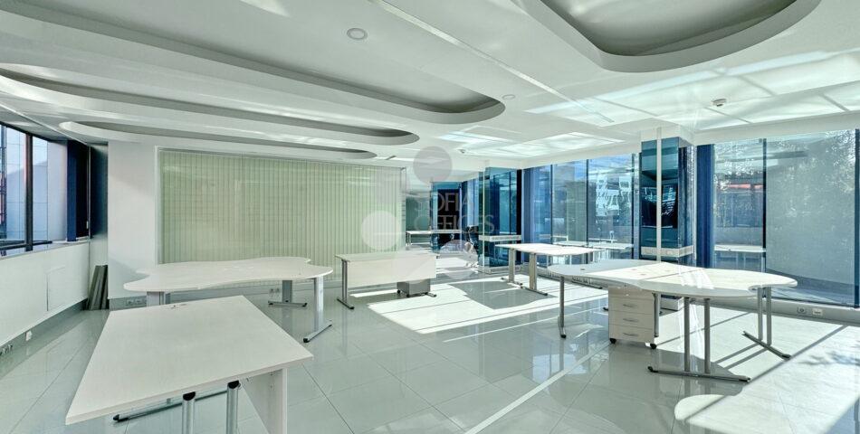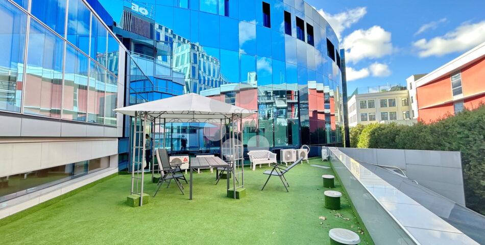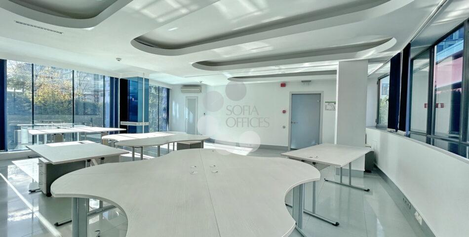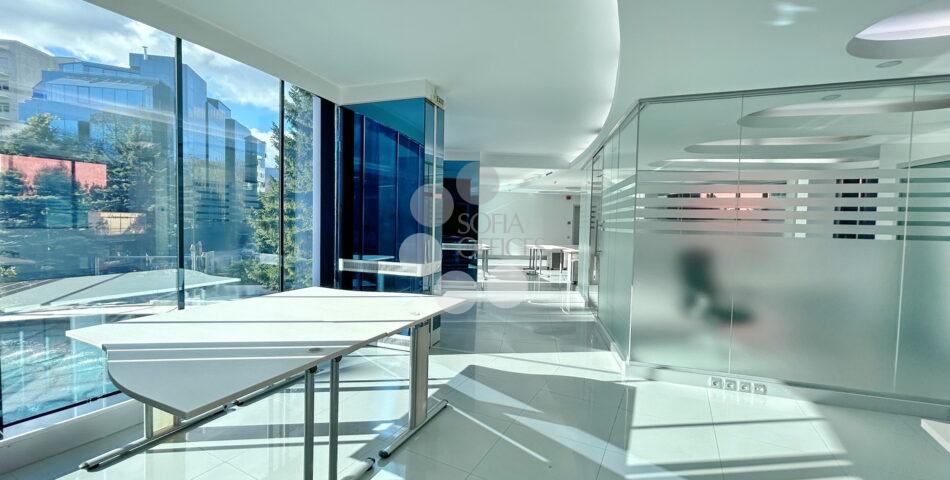 Bright, open space office for rent with a terrace in a class A office building in Lozenets in the business cluster around Tokuda Hospital. The office has a south-west exposure with a view of the landscaped garden of the office building.