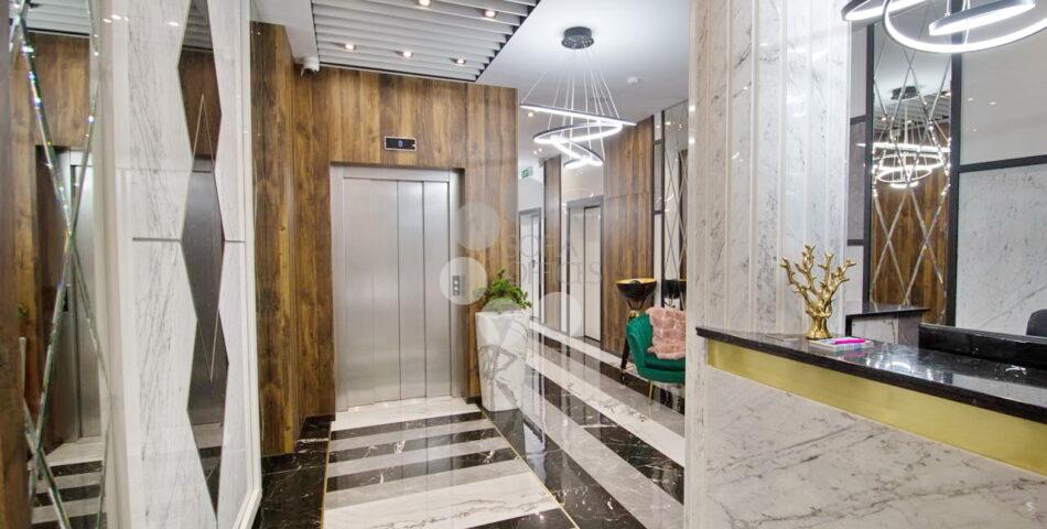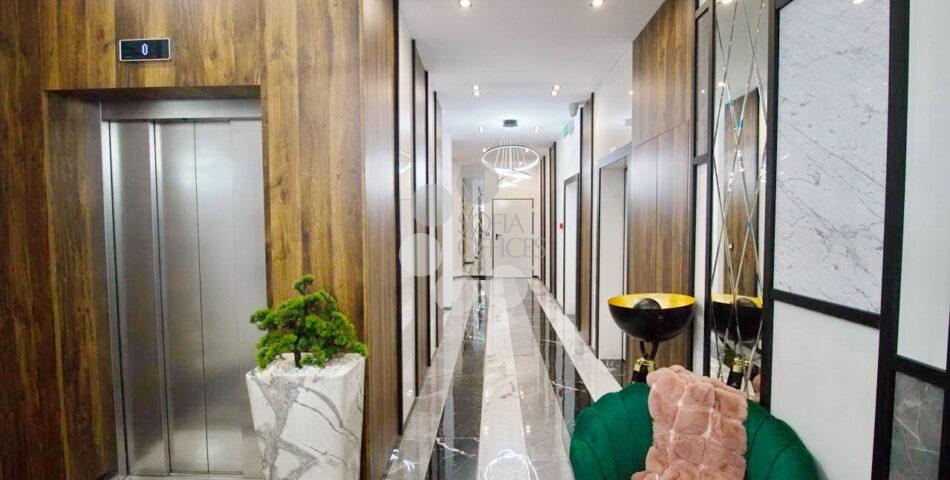 Representative lobby with reception, 24/7 security and video surveillance, access control, restaurant with summer and winter garden, luxurious common areas, two passenger elevators and underground parking.